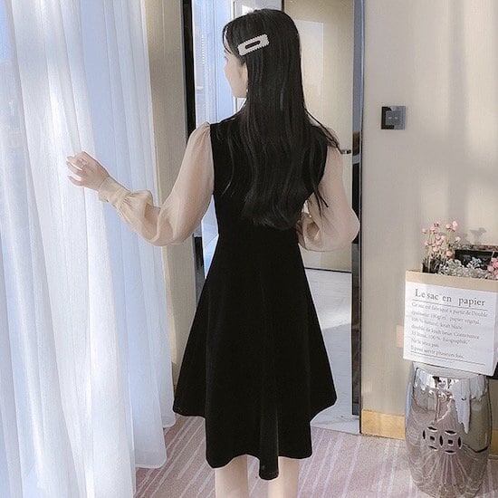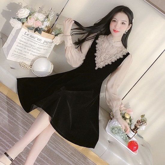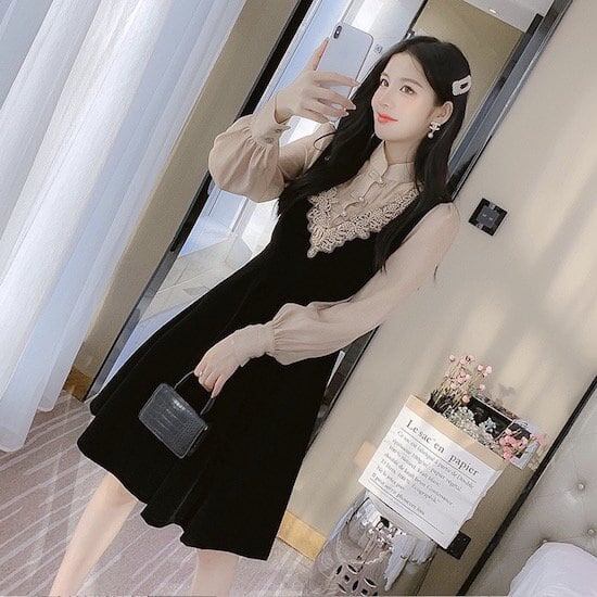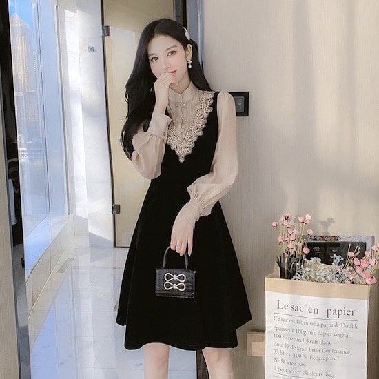 ワンピース ミドル丈 ベルベット 長袖 レース 刺繍 無地 プルオーバー スタンドカラー Aラインスカート ハイウエスト 春 秋 レトロ ブラック ベージュ 10代 20代 お出かけ レディース