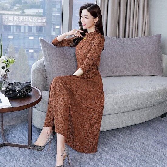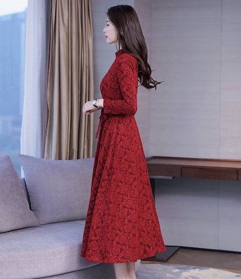 ドレス ロング丈 花柄 パーティードレス 長袖 タートルネック Aライン プルオーバー ハイウエスト プリーツ ベルト 春 秋 レトロ ブラウン レッド ネイビー ブラック 20代 30代 レディース