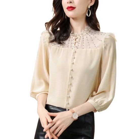 ブラウス レディース 七分袖 春 アプリコット レース ステッチ パール きれいめ フリル フェミニン 透け感 エレガント M L XL 2XL 通勤 仕事 30代 40代 シフォン 清潔感