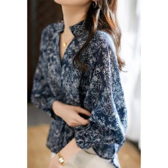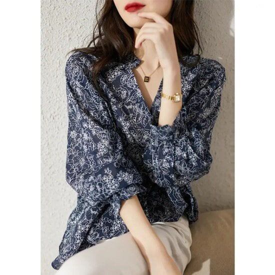 ブラウス レディース ファッション 花柄 Vネック 襟 春 夏 ヴィンテージ オシャレ きれいめ カジュアル 華奢見え 高見え 普段着 M L XL 7分袖 綿100% ブラウス 通勤 羽織り