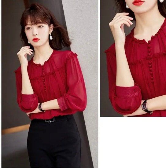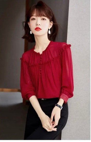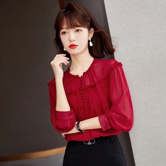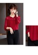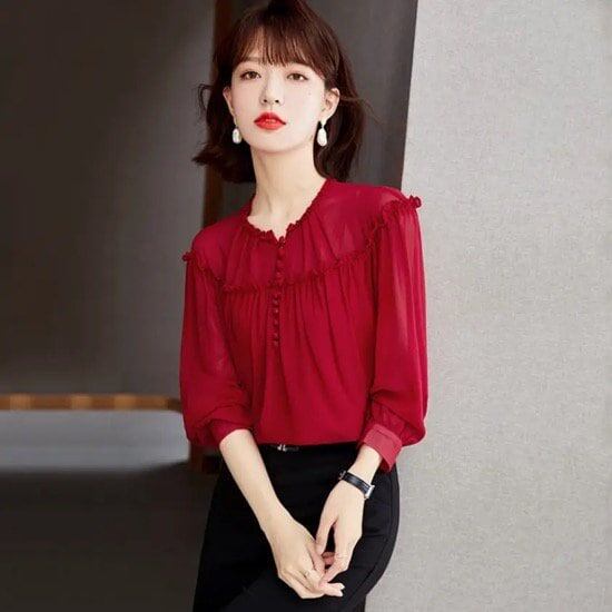 ブラウス レディース 長袖 シフォンシャツ 春 オシャレ レッド S M L XL 2XL ポリエステル 華奢見え きれいめ こなれ感 ランタンスリーブ フリル お呼ばれ