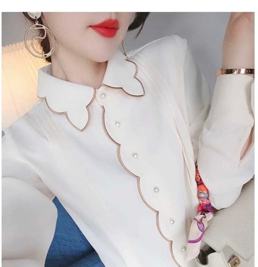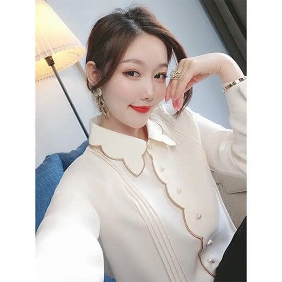 ブラウス レディース 長袖 シフォン ホワイト 夏 トップス オシャレ パール ポリエステル 通勤 お呼ばれ きれい めこなれ感 刺繍 ガーリー フェミニン M L XL 2XL シンプル