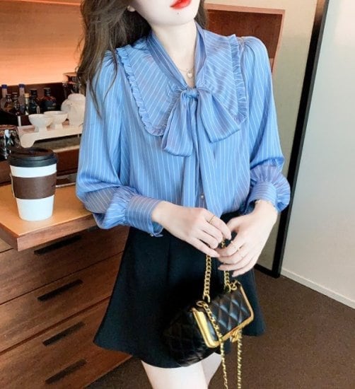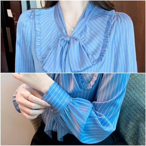 ブラウス シャツ 長袖 ボウタイブラウス 大人 OL オフィス デート おしゃれ シンプル ストライプ スタイリング 春 夏 ショールカラー 上品 大人可愛い シャツ レディース ストライプブラウス