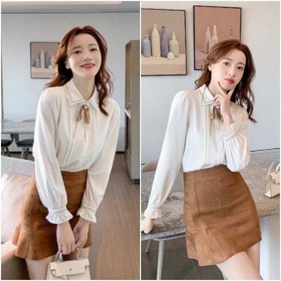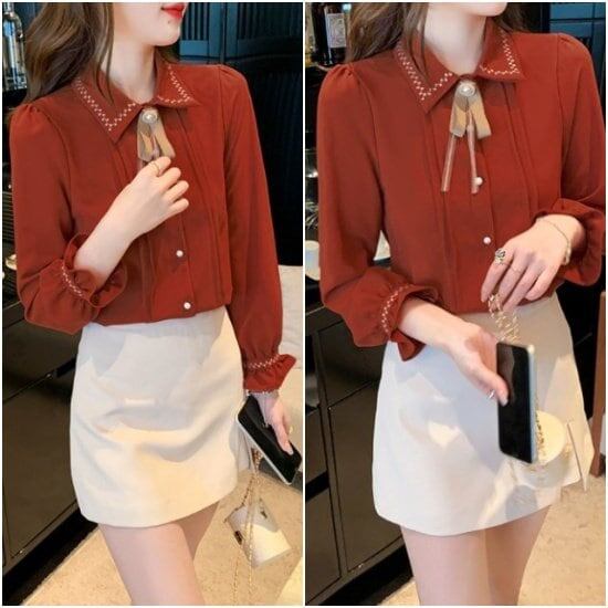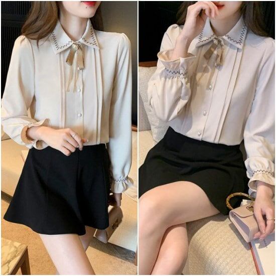 ブラウス シャツ 長袖 リボン 襟配色 おしゃれ シンプル スタイリング すっきり 上品 大人 袖フリル 襟袖テープ使い お呼ばれ お出かけ 通勤 春 夏 秋 ピンタック 可愛い 細身 レディース