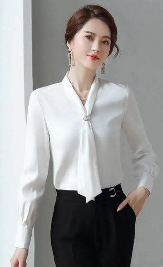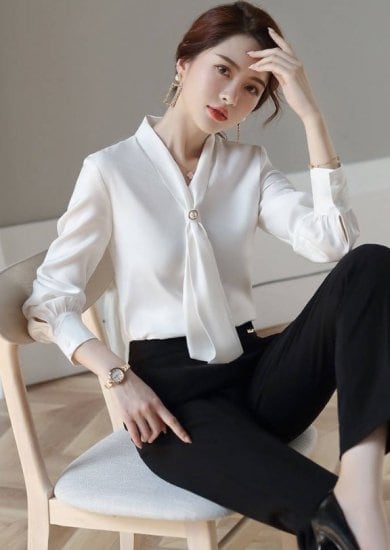 ブラウス オフィス ボウタイブラウス オシャレ シンプル 大人きれいめ フェミニン スタイリング こなれ感 お呼ばれ 発表会 上品 すっきり Vネック 気映え 春 夏 秋 清潔感 シフォン フォーマル