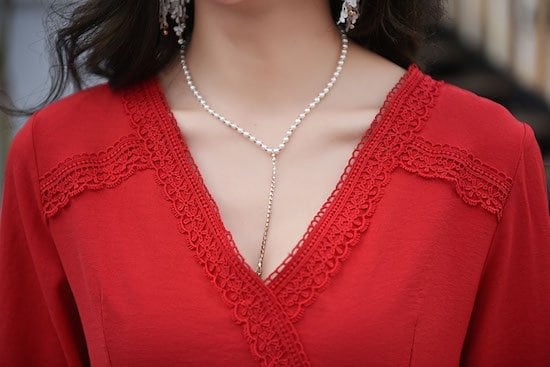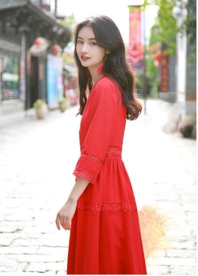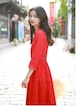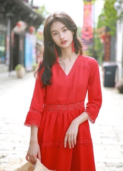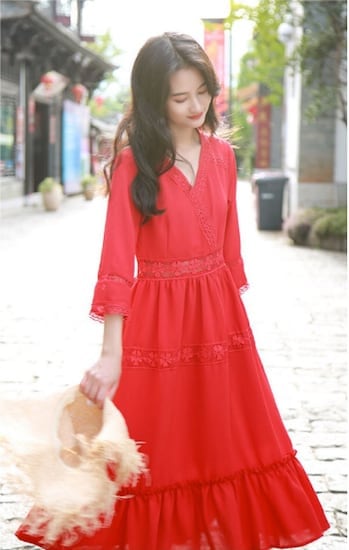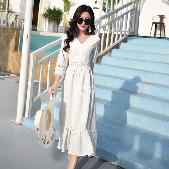 ワンピース ロング丈 七分袖 袖あり ロング ハイウエスト レース ボタン ひざ下 Aラインスカート リゾート 夏 海 レッド 赤 ホワイト 白 レディース 10代 20代 30代 旅行 可愛い