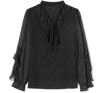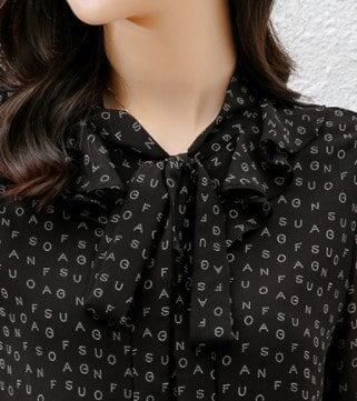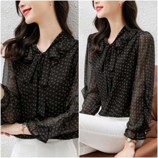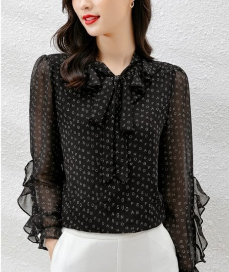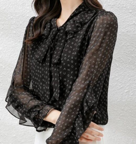ブラウス シャツ レディース 長袖 ブラック フリル リボン ロゴ シフォン 大人可愛い カジュアル シンプル きれいめ お出かけ 通勤 デート お呼ばれ 個性的 透け感 きれい見え 春 夏
