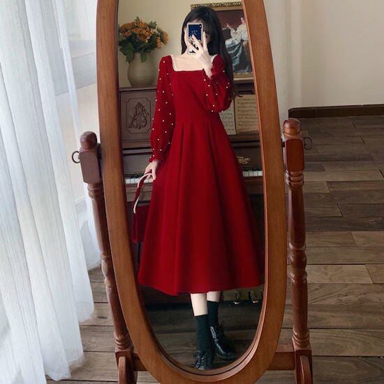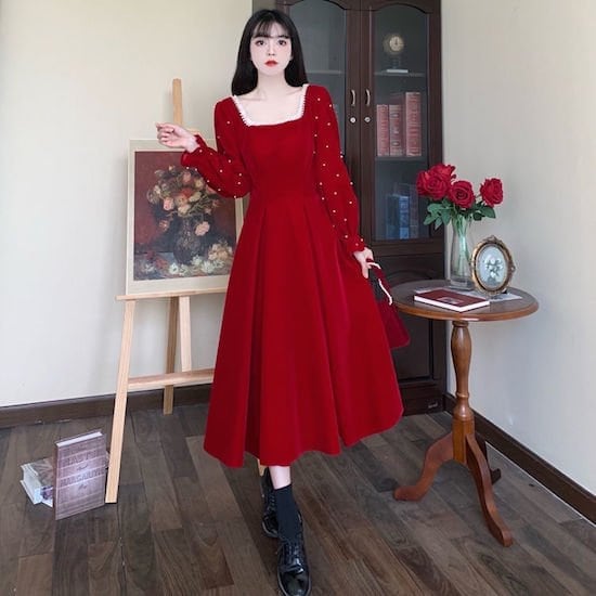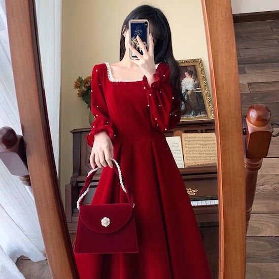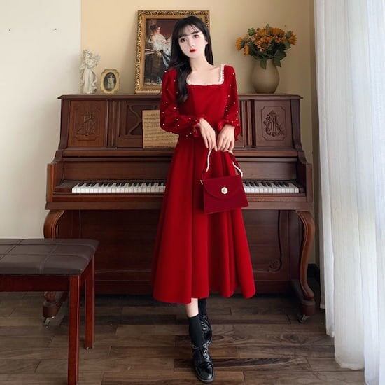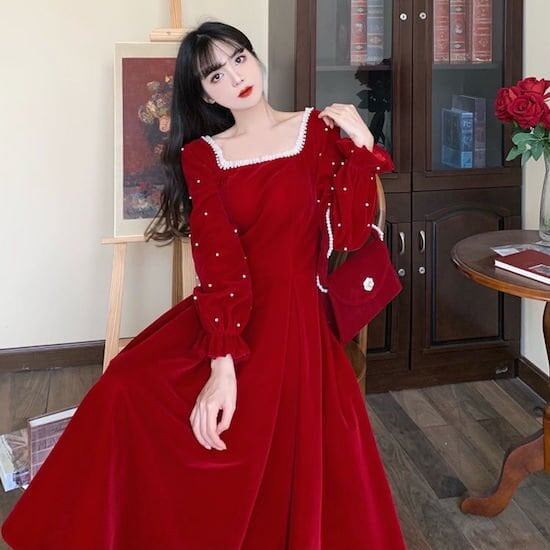 ワンピース ロング丈 長袖 ロング 袖あり レディース 無地 ジッパー ファスナー ベルベット 秋 冬 スクエアネック ワンピドレス レッド 赤 ブラック 黒 お洒落 10代 20代 パーティー