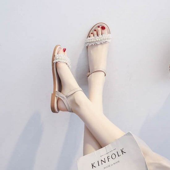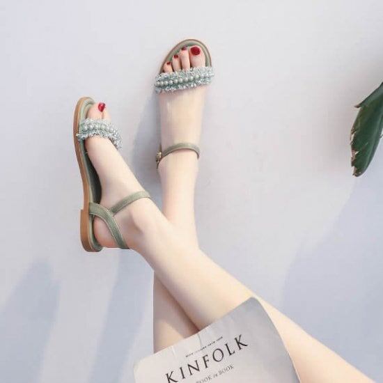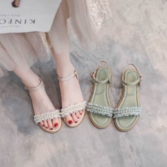 サンダル レディース アンクルストラップ バックバンド パール オープントゥ ストラップ ぺったんこ サンダル 大人可愛い こなれ感 きれいめ リゾート ヒール 1cm