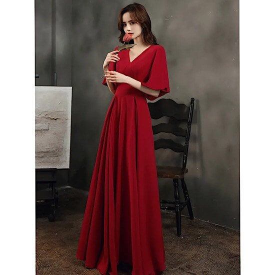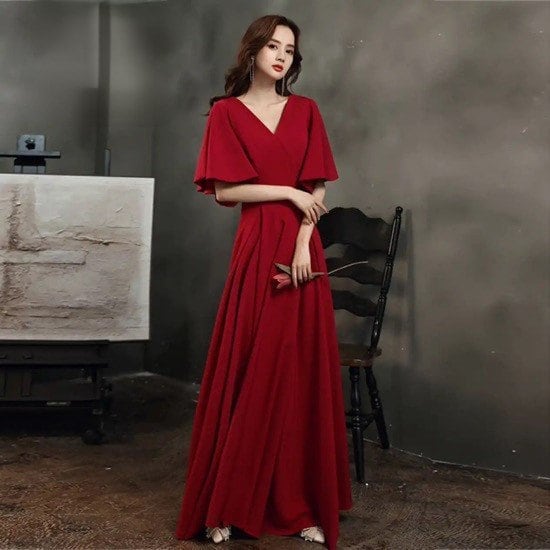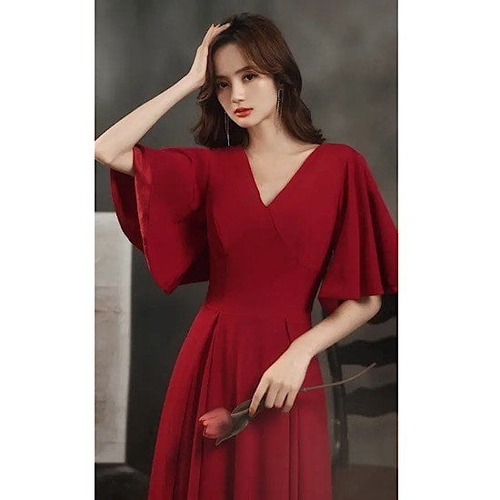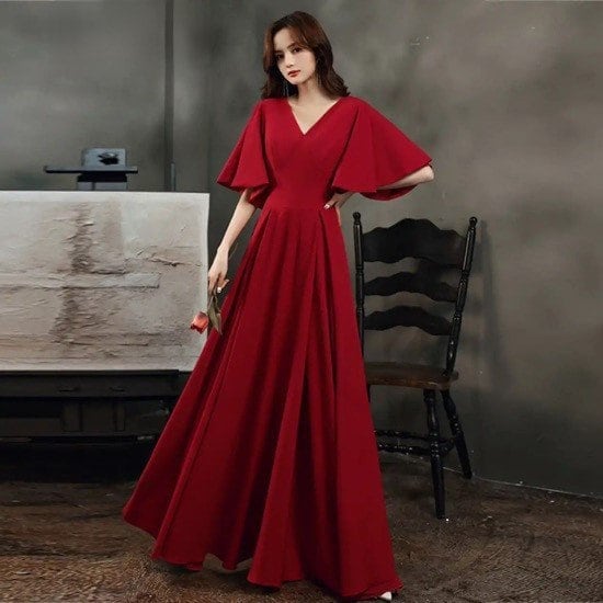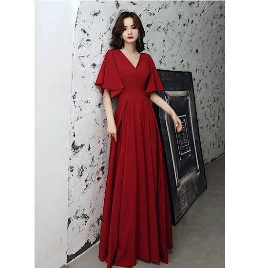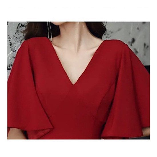 ワンピースドレス イブニングドレス パーティドレス 大きいサイズ ロングワンピース ワインレッド ロングスカート Aラインスカート ドルマン フレアスリーブ ラージサイズ ワンピース