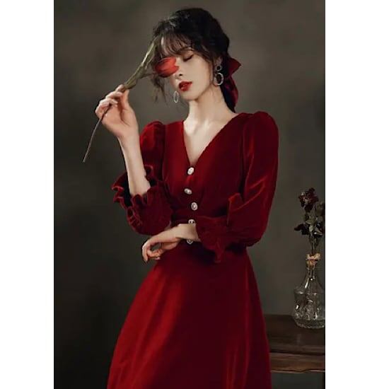 エレガントドレス ベルベットドレス イブニングドレス パーティドレス 結婚式 お呼ばれ ワンピースドレス ロングワンピース ミディアム ワインレッドドレス Aラインワンピース ベルベット