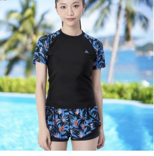 水着 2点セット 半袖 レディース 大きいサイズ ネイビー ブラック カジュアル スポーティー ジム ショートパンツ 海水浴 海 韓国風 オルちゃん ママ 20代 30代 40代 可愛い 私服風