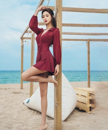 水着 ワンピース型 セクシー レディース 大きいサイズ ブラック レッド 体型カバー 日焼け防止 長袖 シンプル 着痩せ くびれ Vネック 海水浴 プール リゾート 韓国風 オルちゃん 可愛い