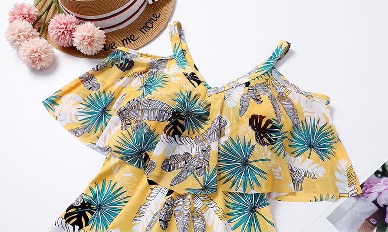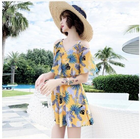 水着 ワンピース スカート イエロー レディース 大きいサイズ プリーツスカート 可愛い デート 体型カバー フリル 花柄 韓国風 オルちゃん 10代 20代 30代 ハワイアン 夏 肩出し