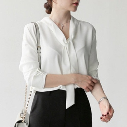 ブラウス シャツ レディース トップス 長袖 ウィングドカフス 無地 ボウタイ 大人可愛い カジュアル シンプル きれいめ お出かけ 通勤 デート ベーシック レトロ