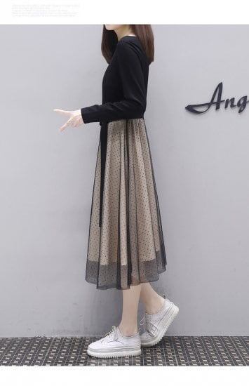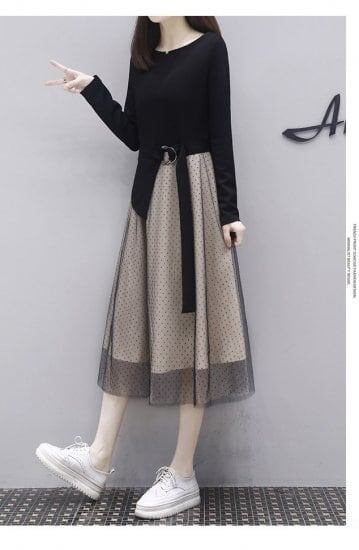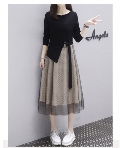 ワンピース ミモレ丈 Aラインスカート アシンメトリー レディース 大きいサイズ プリーツスカート レース ドット ブラック 可愛い 人気 トレンド 韓国風 秋冬 オルちゃん デート 女子会