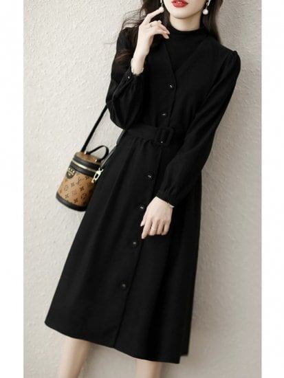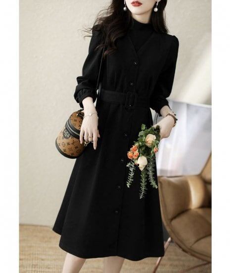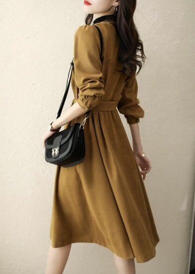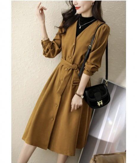 シャツワンピース 膝丈 Aライン レディース 大きいサイズ ブラック イエロー 秋冬 ボタン ウエストマーク 着痩せ きれいめ セレブカジュアル 可愛い 韓国風 トレンド 人気 通勤 通学