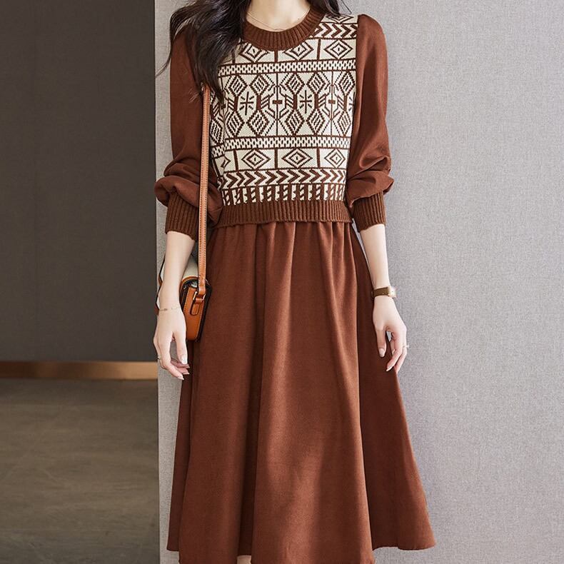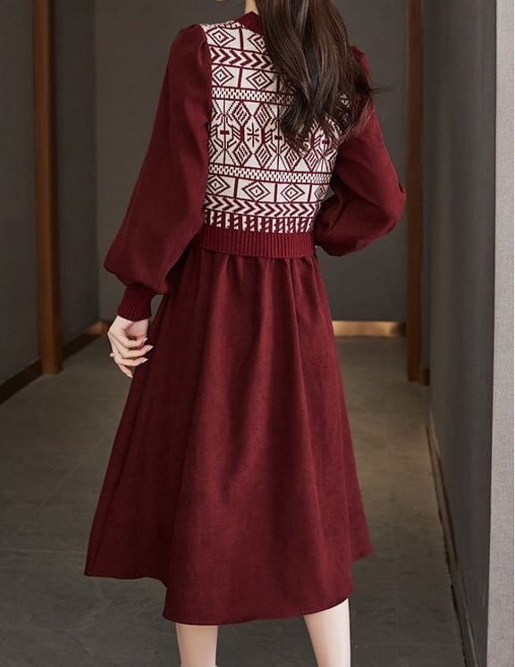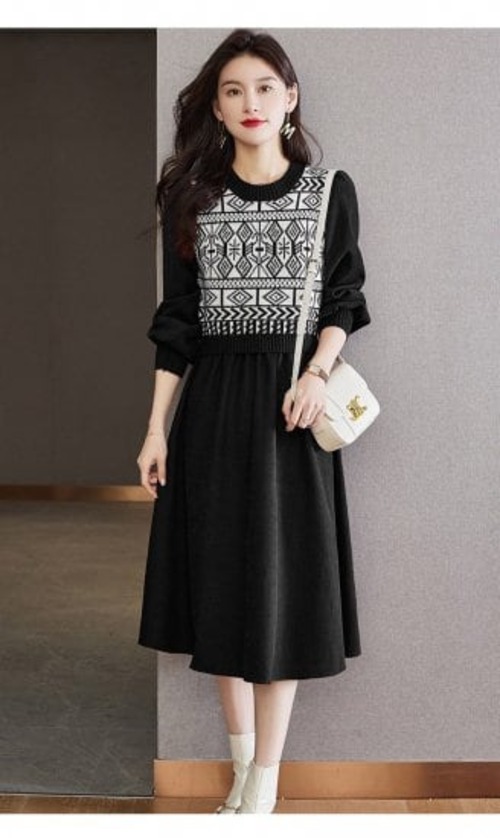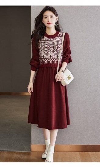 ワンピース 切り替え ミモレ丈 フレアスカート 大きいサイズ レディース ブラック レッド ブラウン 可愛い あったか 秋冬 韓国風 オルチャン シンプル 着痩せ 10代 20代 30代