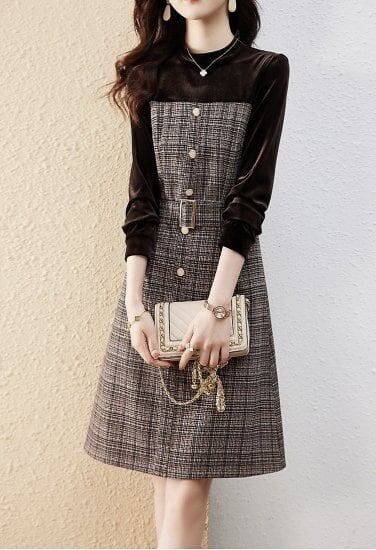 ワンピース ドレス チェック柄 ミニ丈 ミニスカート レディース 大きいサイズ ベルト ウエストマーク 着痩せ かわいい エレガント ブラウン 韓国風 オルチャン デート 女子会 おでかけ