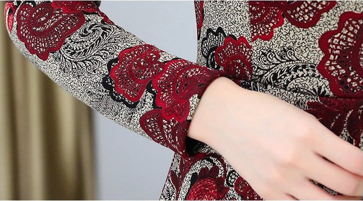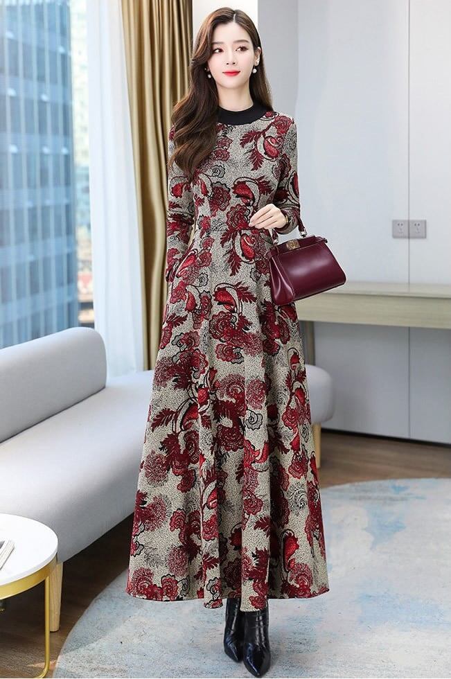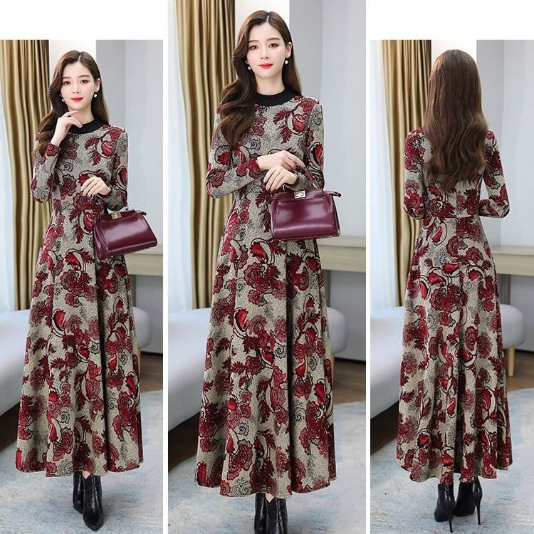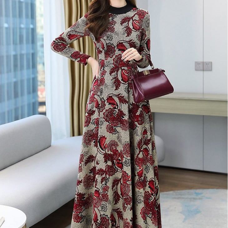 ワンピース ミモレ丈 長袖 ラウンドネック 花柄 裏起毛 防寒 大きいサイズ 大人可愛い カジュアル きれいめ お出かけ デート 女子会 お出かけ レディース 上品 Aライン