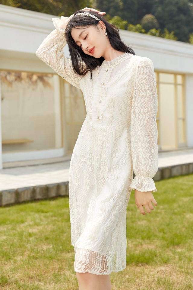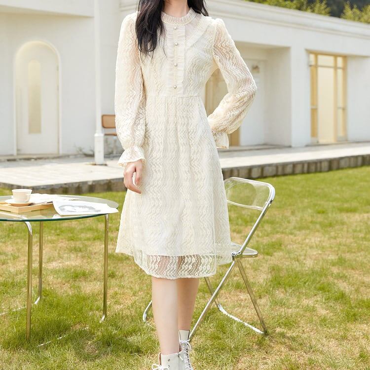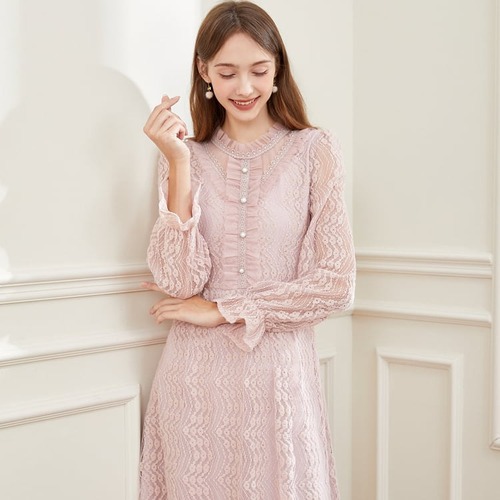 ワンピース 膝丈 長袖 総レース レースワンピ ベルスリーブ 大人可愛い カジュアル きれいめ お出かけ 通勤 デート 女子会 レディース 上品 通学 ハイウエスト レトロ