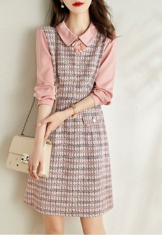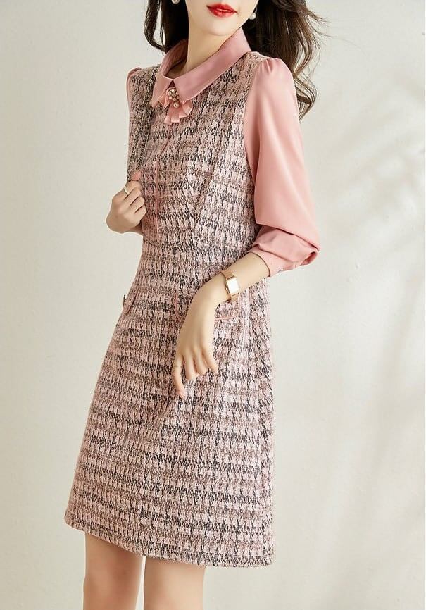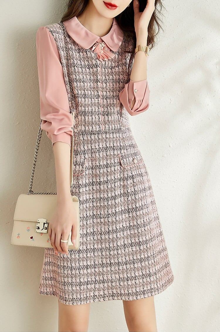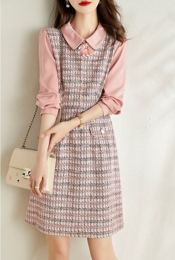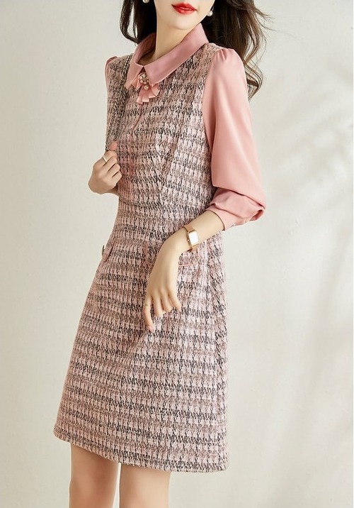 ワンピース ミニ丈 長袖 ツイードワンピ ワンピ Aライン スタンダードカラー リボンタイ 大きいサイズ 大人可愛い きれいめ お出かけ デート 女子会 お出かけ レディース 上品