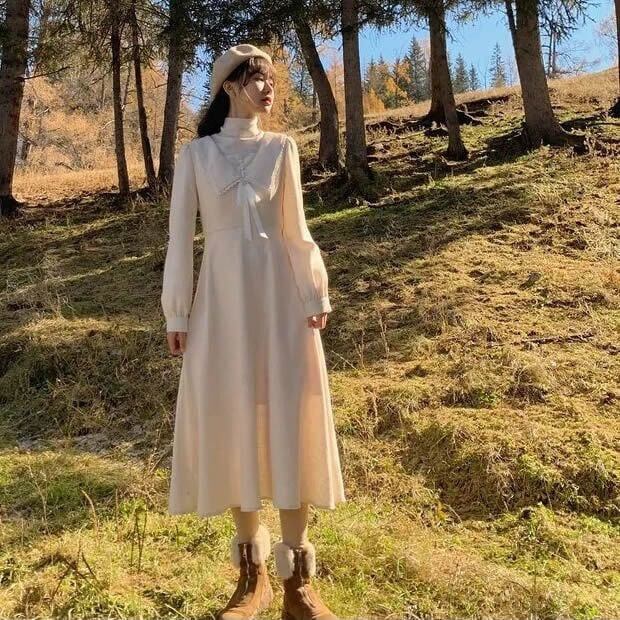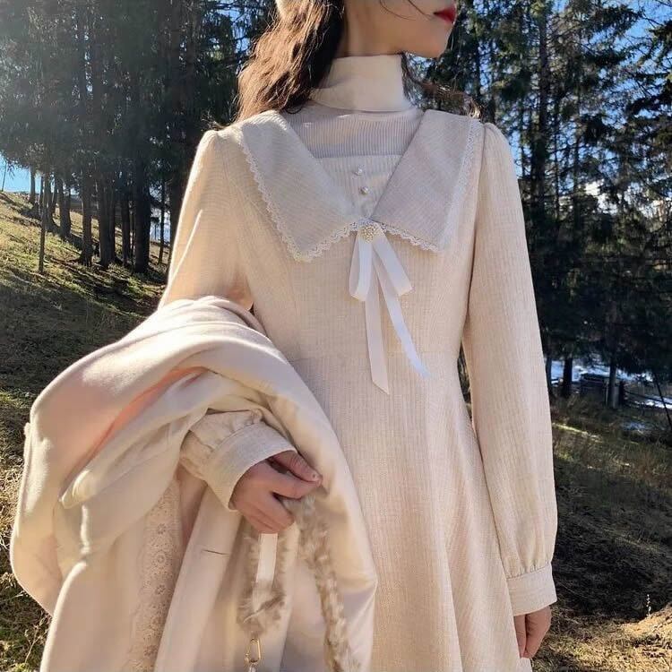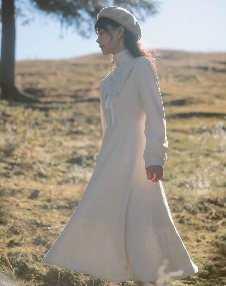 ワンピース ニット ひざ下丈 長袖 無地 大人可愛い カジュアル ガーリー お出かけ 通勤 デート 女子会 重ね着風 レディース ニットワンピース 上品 通学
