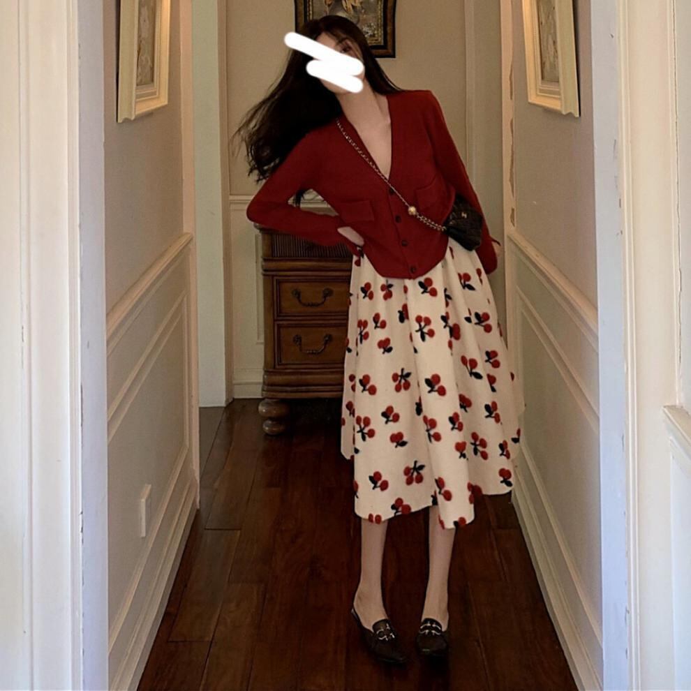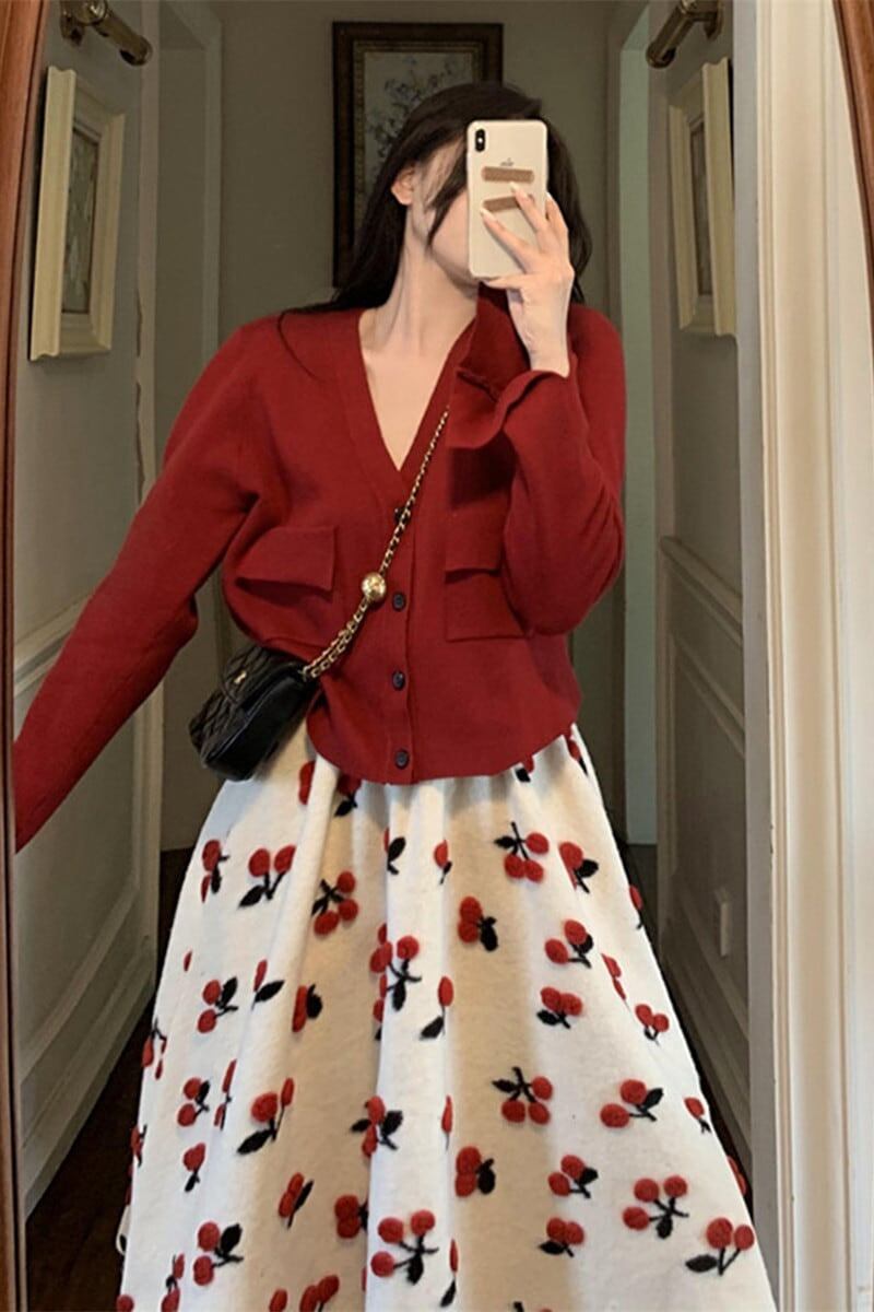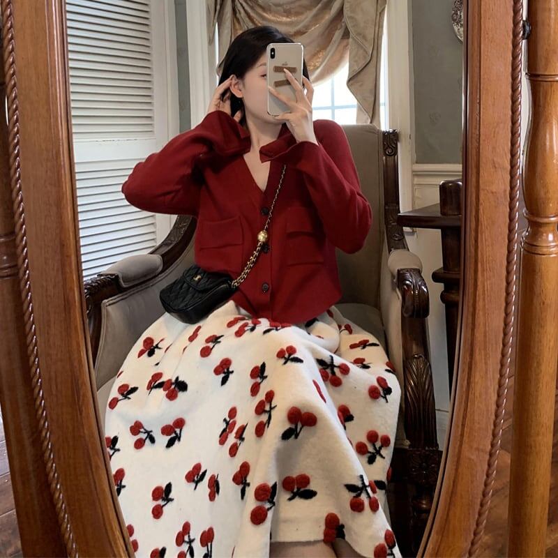 セットアップ 上下セット レディース 2点セット 大人可愛い ニット カーディガン 長袖 ミモレ丈 フレア さくらんぼ 大きいサイズ ガーリー カジュアル 通勤 通学 デート 女子会