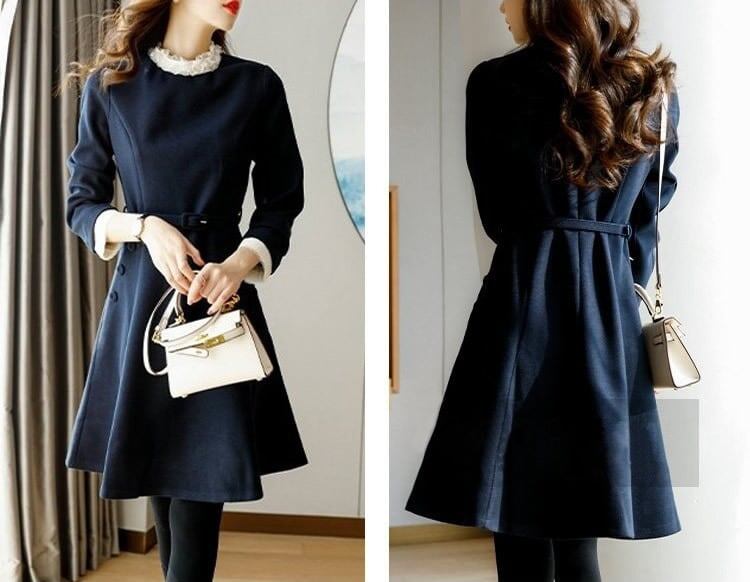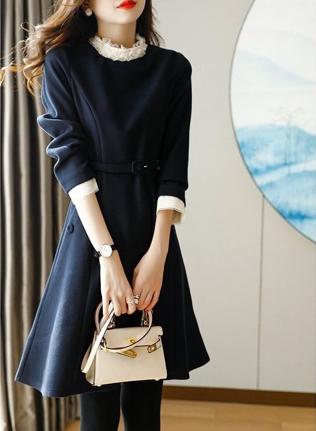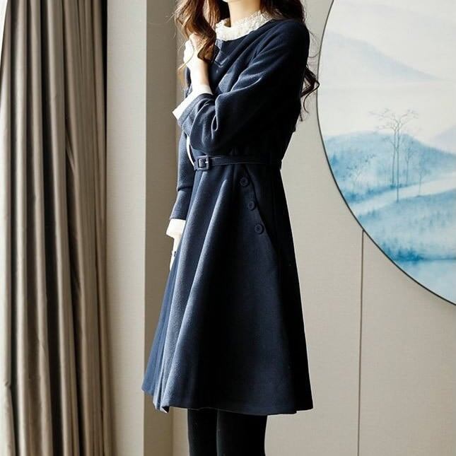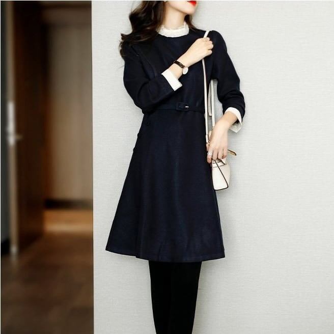 ワンピース ミニ丈 立ち襟 長袖 無地 ベルト付き ワンピ レース 大人可愛い カジュアル きれいめ お出かけ 通勤 デート 女子会 レディース 上品 通学 ハイウエスト
