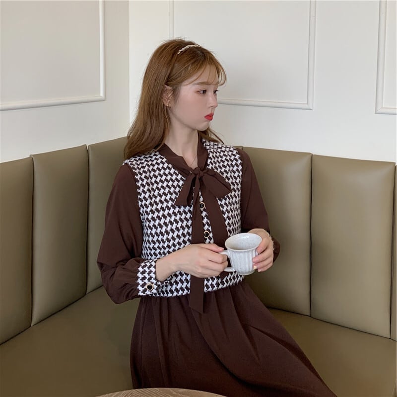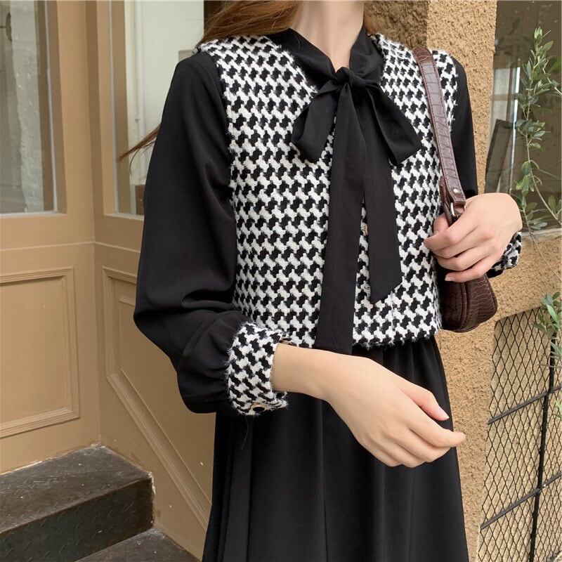 セットアップ ワンピース ベスト ひざ丈 長袖 千鳥格子 ワンピ 大人可愛い カジュアル きれいめ お出かけ 通勤 デート 女子会 レディース 上品 通学 大きいサイズ