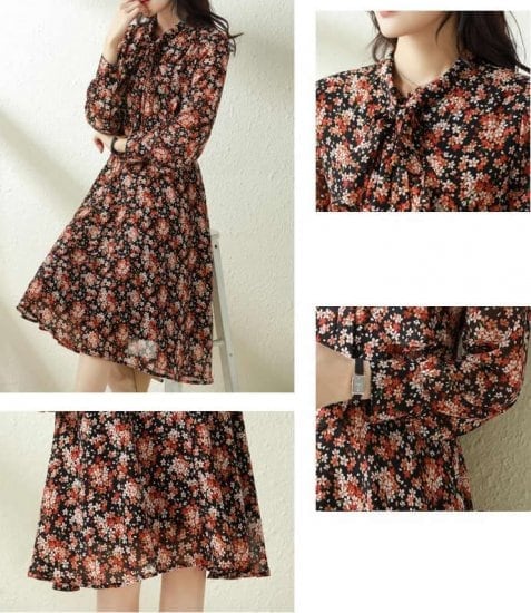ワンピース シフォンワンピース レディース ひざ丈 ボウタイ 長袖 ワンピ 花柄 Aライン 大人可愛い フォーマル きれいめ 上品 お出かけ デート 女子会 通勤 通学 ハイウエスト