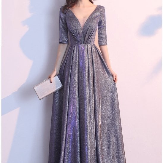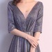 ロングドレス ラメ 半袖 五分袖 Vネック レースアップ オーロラ ナイトドレス パーティードレス 演奏会 発表会 二次会 イブニングドレス シンプル 大きいサイズ
