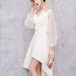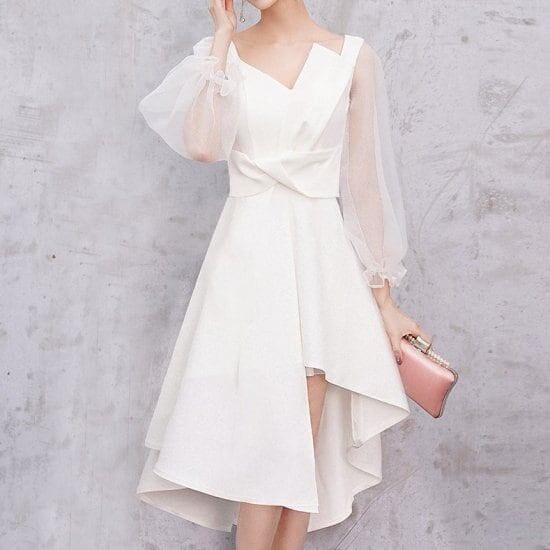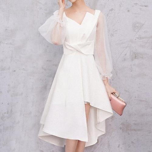 ドレス ワンピース ミニスカート ヘムライン アシンメトリー 袖あり シースルー パフスリーブ 白 パーティードレス Aライン ミニドレス レディース ホワイト 同窓会 発表会 演奏会 大きいサイズ