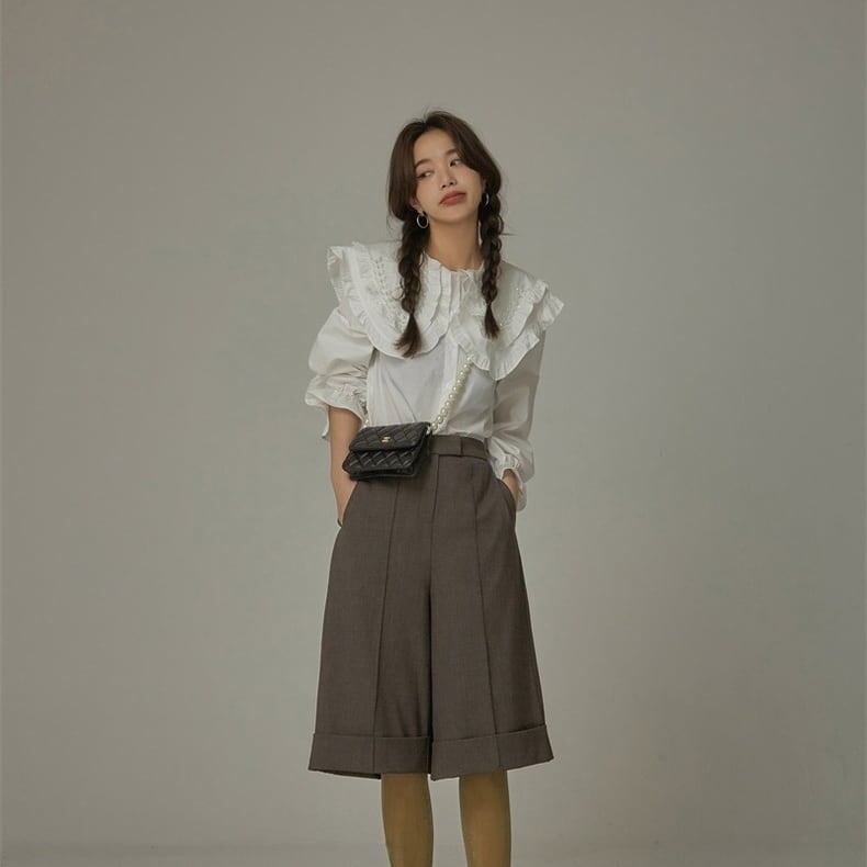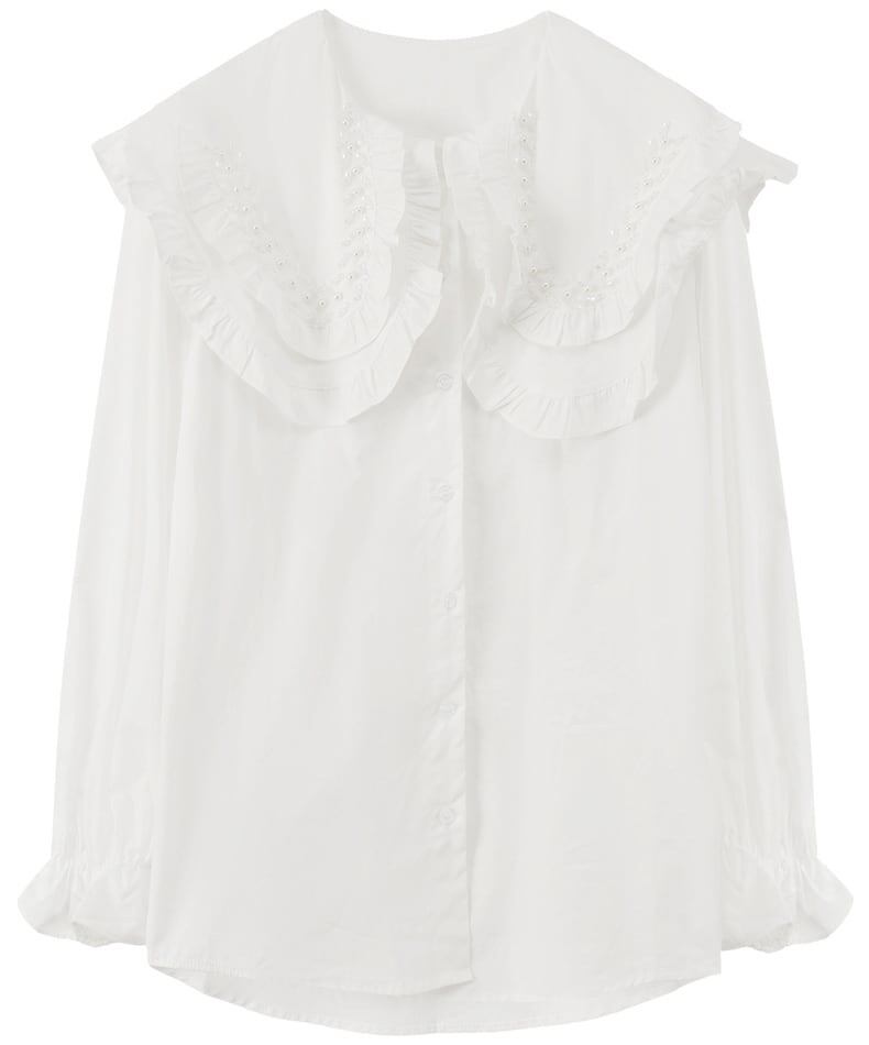 ブラウス シャツ 綿 レディース 二重襟 長袖 ベルスリーブ 無地 フリル 大人可愛い カジュアル フェミニン ガーリー お出かけ 通勤 デート ベーシック レトロ