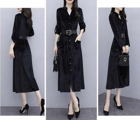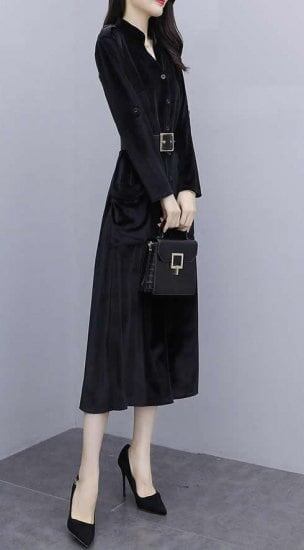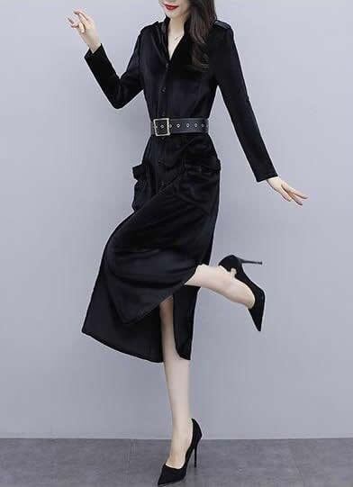 ワンピース レディース ミモレ丈 長袖 ワンピ 立ち襟 Vネック 無地 Aライン 大きいサイズ 大人可愛い フェミニン きれいめ 上品 お出かけ デート 女子会 通勤 通学 ブラック 黒