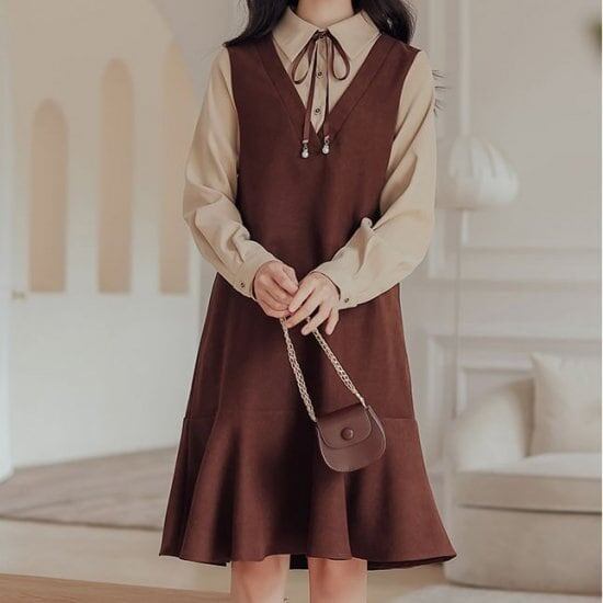 ワンピース レディース ひざ丈 スタンダードカラー リボンタイ 長袖 無地 大人可愛い 上品 きれいめ エレガント お出かけ デート 通勤 通学 レトロ ハイウエスト
