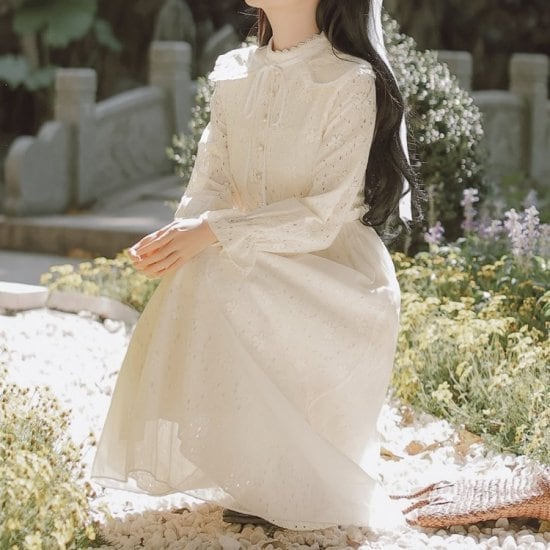ワンピース レディース ミモレ丈 ラッフルカフス 長袖 無地 総レース リボンタイ 透け感 大人可愛い カジュアル ガーリー お出かけ デート 通勤 通学 レトロ ハイウエスト