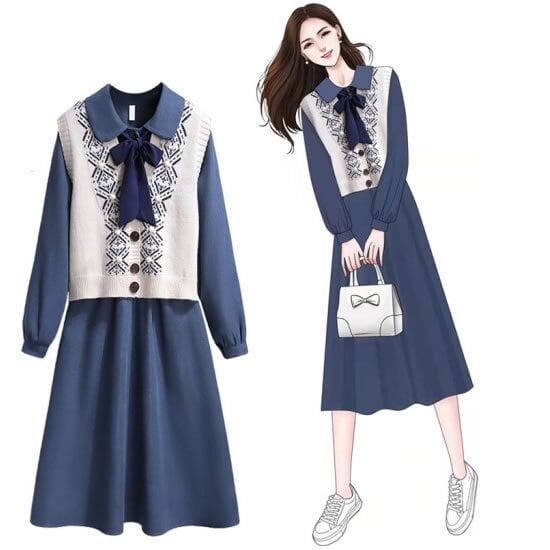 セットアップ ワンピース ベスト ニット ワンピ レディース 2点セット 膝丈 無地 大人可愛い ガーリー カジュアル 長袖 韓国 通勤 通学 デート Aライン 上品