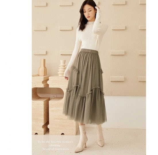 スカート ミモレ丈 チュールスカート 不規則 ウエストゴム 大きいサイズ レディース カーキ きれいめ カジュアル 可愛い 韓国風 オルちゃん 春 秋 デート 女子会 10代 20代 30代