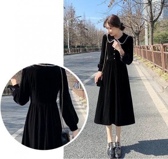 ワンピース レディース ひざ丈 長袖 ワンピ フラットカラー ベルベット風 無地 Aライン 大人可愛い カジュアル ガーリー 上品 お出かけ デート 女子会 通勤 通学 レトロ