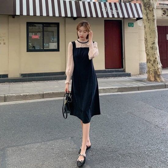 ワンピース 膝丈 長袖 ワンピ 異素材 立ち襟 ラッフルカフス 大人可愛い カジュアル きれいめ お出かけ 通勤 デート 女子会 レディース 上品 通学 ハイウエスト レトロ