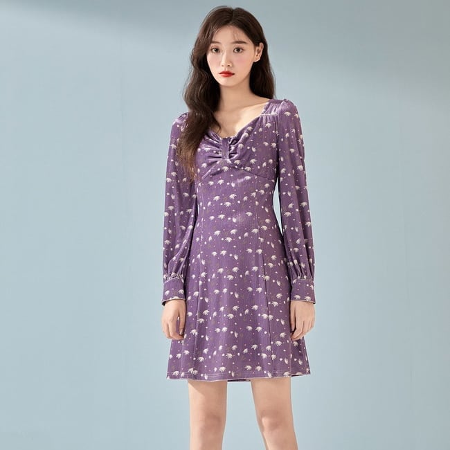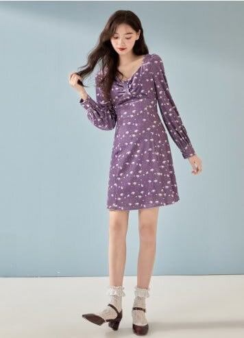 ワンピース ミニ丈 パープル レディース パープル リボン ミニスカート 長袖 カジュアル フェミニン 可愛い 秋 冬 セクシー 韓国風 オルちゃん 10代 20代 デート 男子ウケ 人気 トレンド