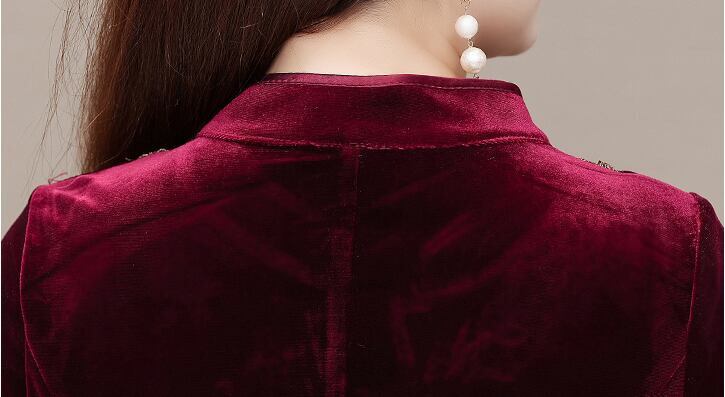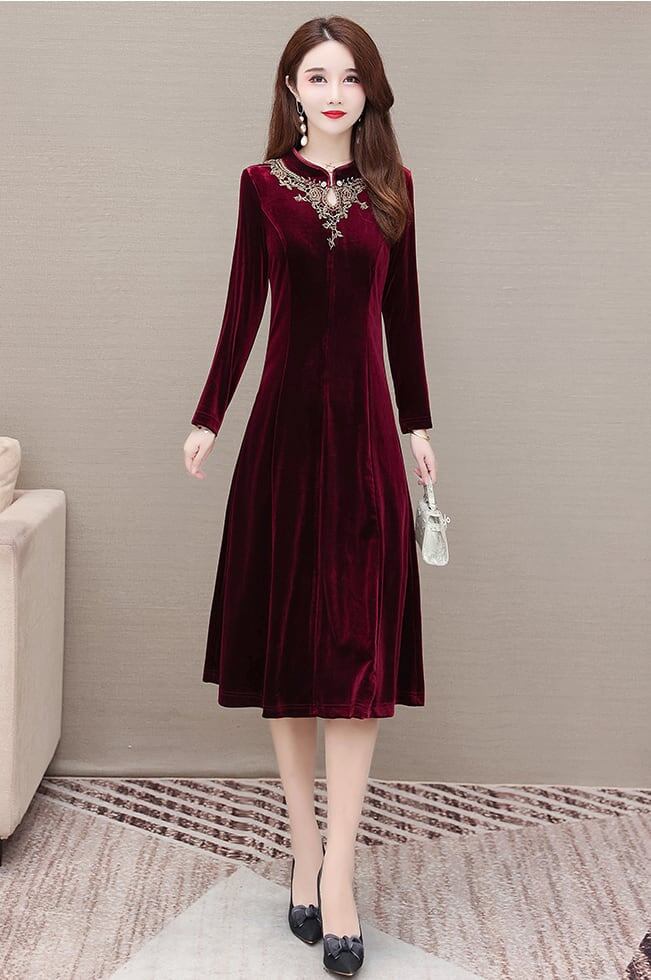 ベルベットドレス パーティドレス チャイナドレス ひざ下丈 長袖 Iライン 刺繍 大きいサイズ レディース エレガント 華やか 上品 発表会 パーティ お呼ばれ