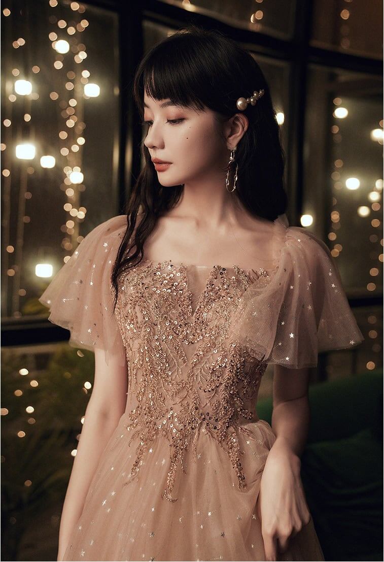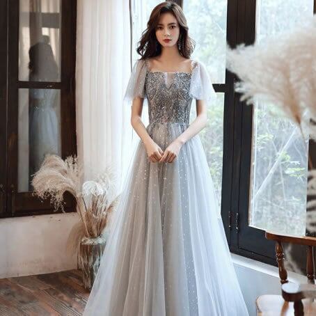 ロングドレス イブニングドレス マキシ丈 半袖 刺繍 スパンコール Aライン 大きいサイズ 透け感 レディース エレガント 華やか 上品 発表会 演奏会 パーティー お呼ばれ 結婚式