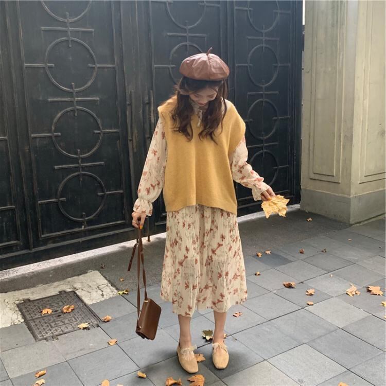 セットアップ ワンピース ベスト レディース 2点セット ミモレ丈 ワンピ 上下セット 花柄ワンピース ニット 透け感 きれいめ 上品 カジュアル 長袖 韓国 大きいサイズ 通勤 通学