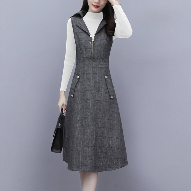 セットアップ カットソー ジャンパースカート レディース 2点セット 膝丈 ガーリー 上品 スカート チェック かわいい 長袖 韓国 大きいサイズ 通勤 通学 オフィス
