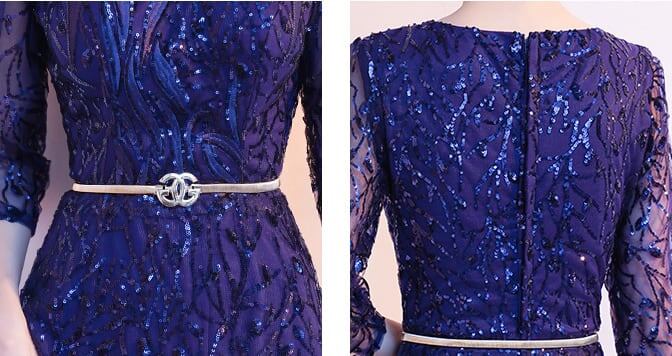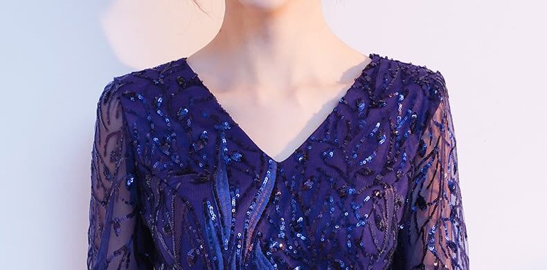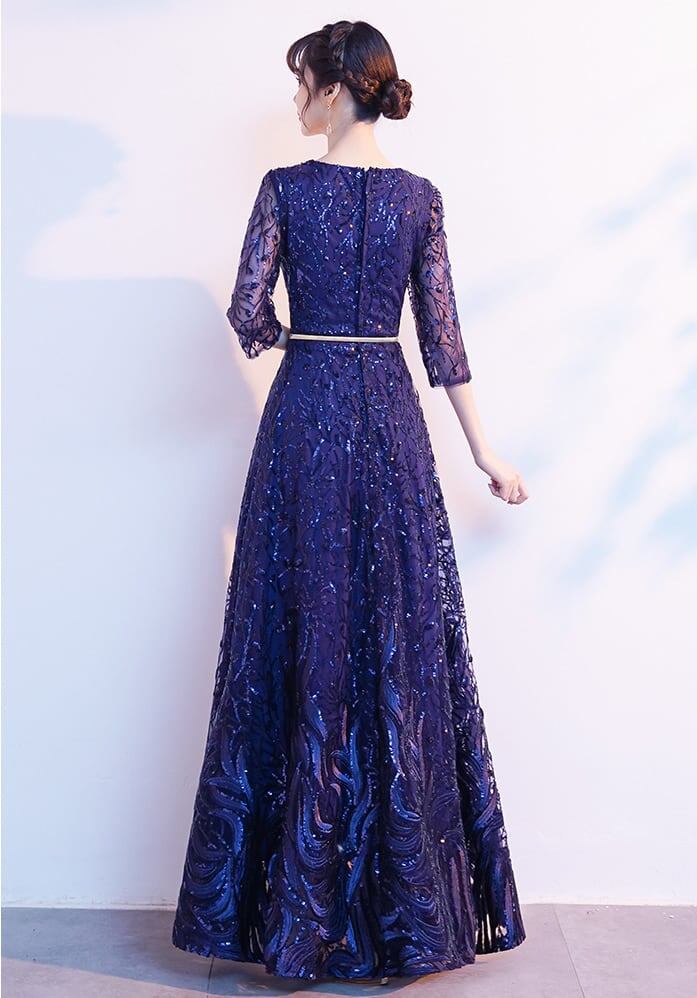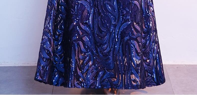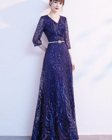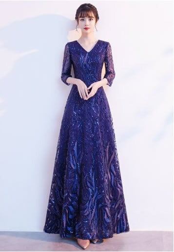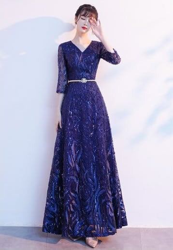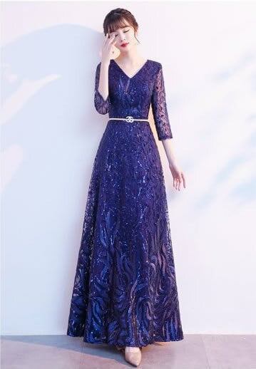ドレス イブニングドレス ブルー Aライン 大きいサイズ ロングドレス モエレ丈 スタイルアップ ウエストマーク Vネック 5分丈 きれいめ キラキラ 華やか エレガント パーティー 二次会 秋冬