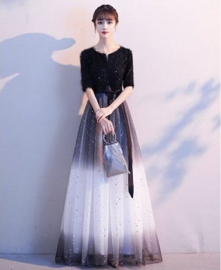 ドレス ロングドレス イブニングドレス 大きいサイズ モエレ丈 ウエスト切り替え 華やか エレガント Aライン 演奏会 発表会 ウェディング パーティー 秋冬 チュールスカート リボン 可愛い