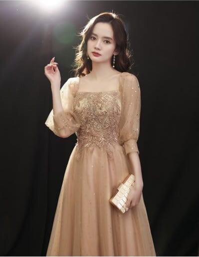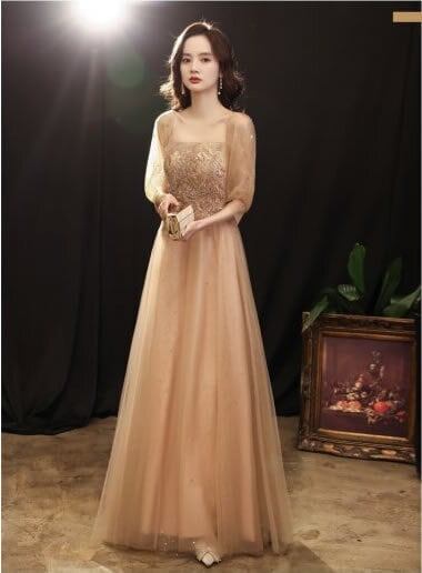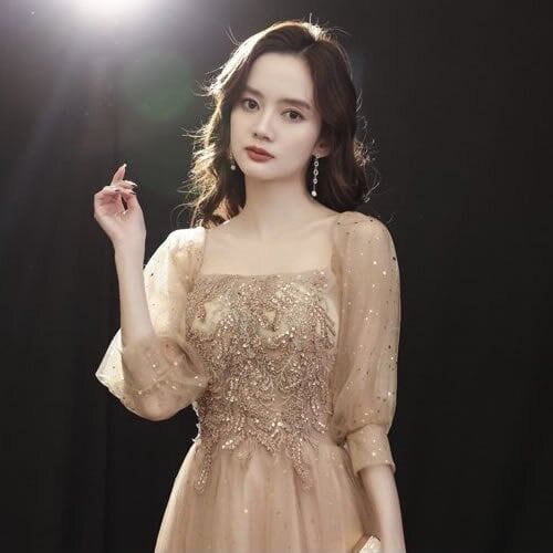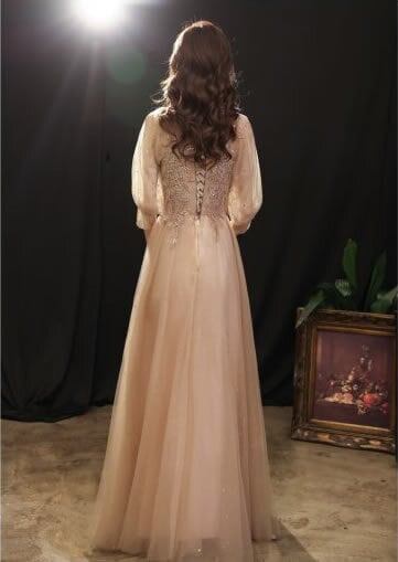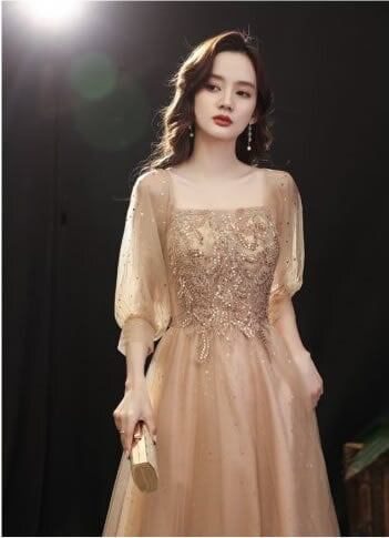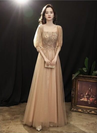 ドレス イブニングドレス パフスリーブ ロングドレス マキシ丈 大きいサイズ 袖あり ウェディングドレス 二次会 発表会 パーティードレス 大人 カラードレス 華やか ゴージャス チュール Aライン
