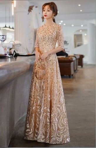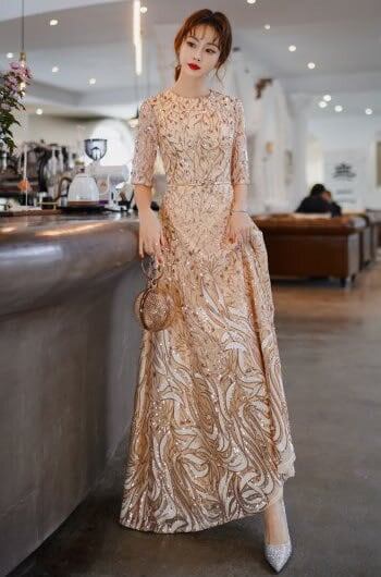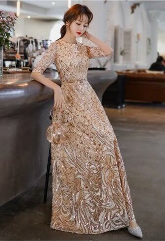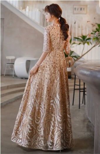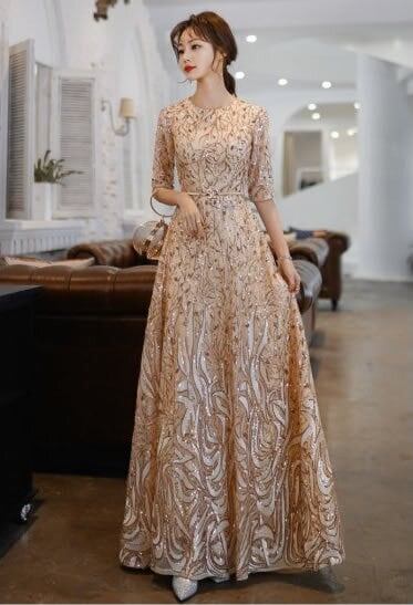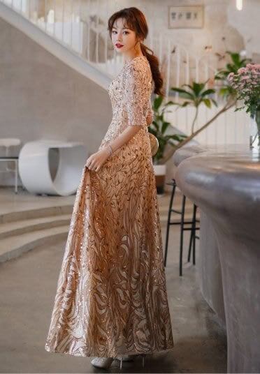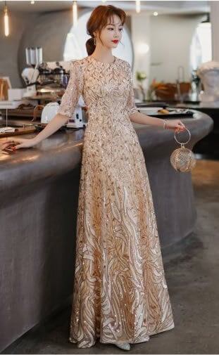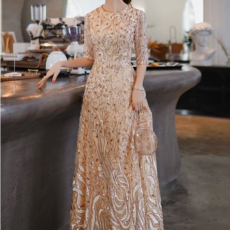 ドレス イブニングドレス ロング ワンピース モエレ丈 大きいサイズ キラキラ エレガント ゴージャス ウエストマーク 着痩せ パーティー 二次会 大人 きれいめ 華やか 結婚式ワンピース 5分丈